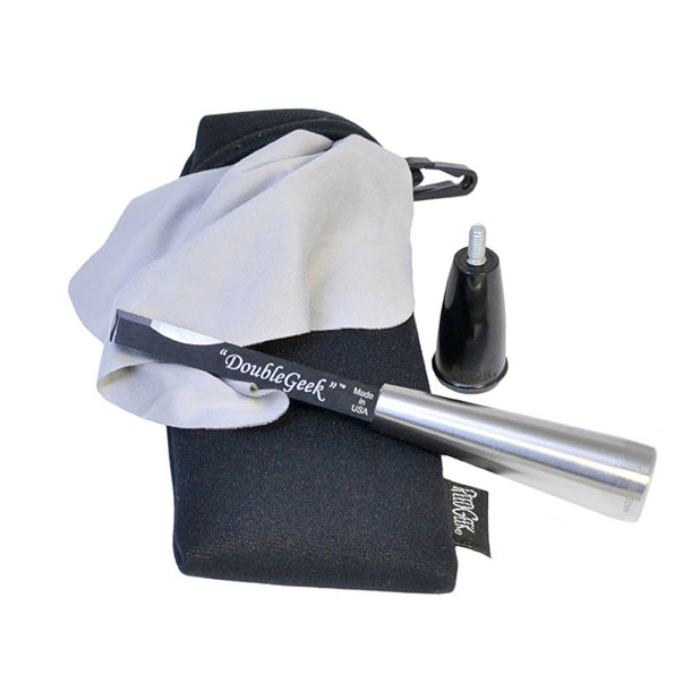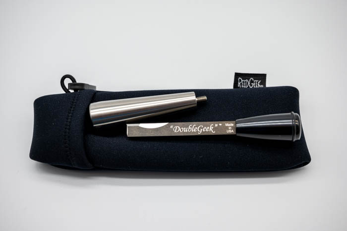 For added leverage and familiarity in the hand the set includes a 3 inch stainless steel handle and a small black palm handle, both threaded for easy attachment to the DoubleGeek.